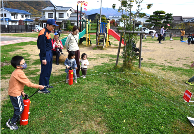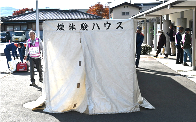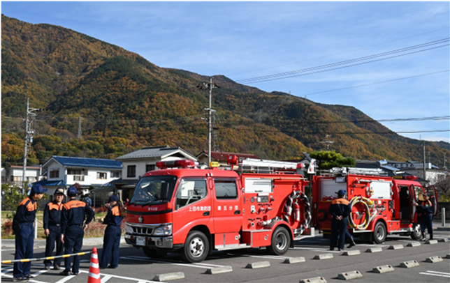11月16日(土) | 西部まちづくりフェスタ まちづくりフェスタに防災部会として参加しました。上田消防署、第5分団、第8分団にご協力いただきました。 消防署からは3人の職員が来てくださり、「煙体験ハウス」と「水消火器」の実演どちらもたくさんの来場者が体験し、非常によい機会になりました。 第5分団と第8分団からは、消防車が来てくれました。特に子どもたちには大人気で、乗せてもらって大喜びでした。 |